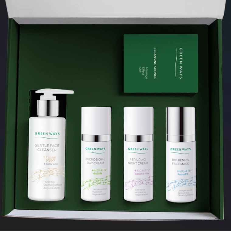 Exklusives Green Ways Geschenkpaket vorbereitet, das unsere hochwertigen Kosmetikprodukte in einem schönen Set vereint. Im Geschenkset ist auch ein Gesichtsreinigungsschwamm mit sanftem Peeling-Effekt enthalten, der hilft abgestorbene Hautzellen zu entfernen, und die Haut erfrischt und belebt. Der Schwamm ist ein hervorragendes Hilfsmittel, um Gesichtsmasken zu entfernen und die Haut mit Ihrem bevorzugten Reinigungsgel zu reinigen. Das Green Ways Kosmetikset ist nicht nur ein schönes Geschenk für Ihre Nächsten, sondern dank der ökologischen Zertifizierung der naturfreundlichen Inhaltsstoffe auch Ausdruck Ihres Umweltbewusstseins.